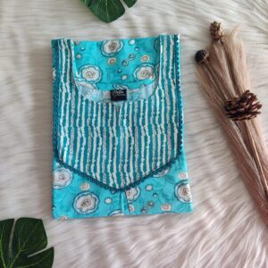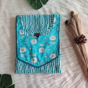 Aqua Blue And Cream Printed Premium Cotton Mix N Match Lace Pocket Nighty | Free Size | Chest Width 44″| Length 56″