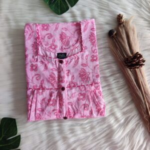 Pink Floral Printed Printed Pure Cotton Button Zip Nighty | Free Size | Chest Width 44″| Length 55″-56″