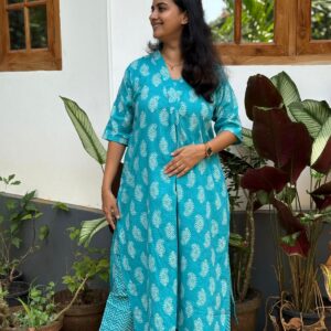 Blue Kalamkari Printed Kantha Cotton Kurti 2 Piece Co-ord Set | BK0047