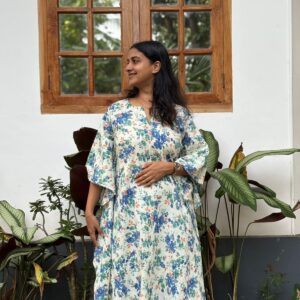 Blue Floral Printed White Kantha Cotton Short Kaftan | BK0049