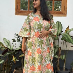 Orange And Green Floral Printed Kantha Cotton Short Kaftan | BK0051