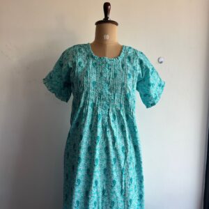Aqua Blue Printed Premium Cotton Ruffle Neck Button Nighty | Chest Width 44″ | Length 54″-56″|