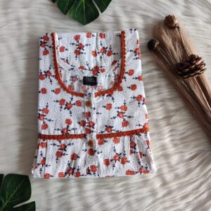 Orange Floral Printed Premium Cotton Lace Button Nighty | Free Size | Chest Width 44″| Length 54″-56″|