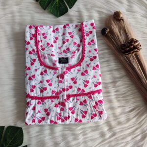 Pink Floral Printed White Premium Cotton Lace Button Nighty | Free Size | Chest Width 44″| Length 54″-56″|
