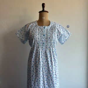 Blue Floral Printed White Premium Cotton Ruffle Neck Button Nighty | Chest Width 44″ | Length 54″-56″|