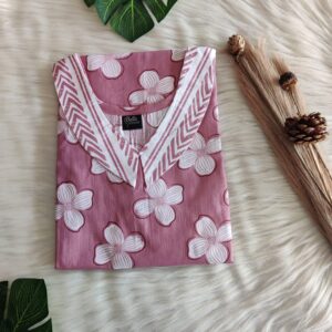 Pink And White Floral Printed Premium Cotton Peter Pan Collar Nighty | Free Size | Chest Width 44″| Length 55″-56″