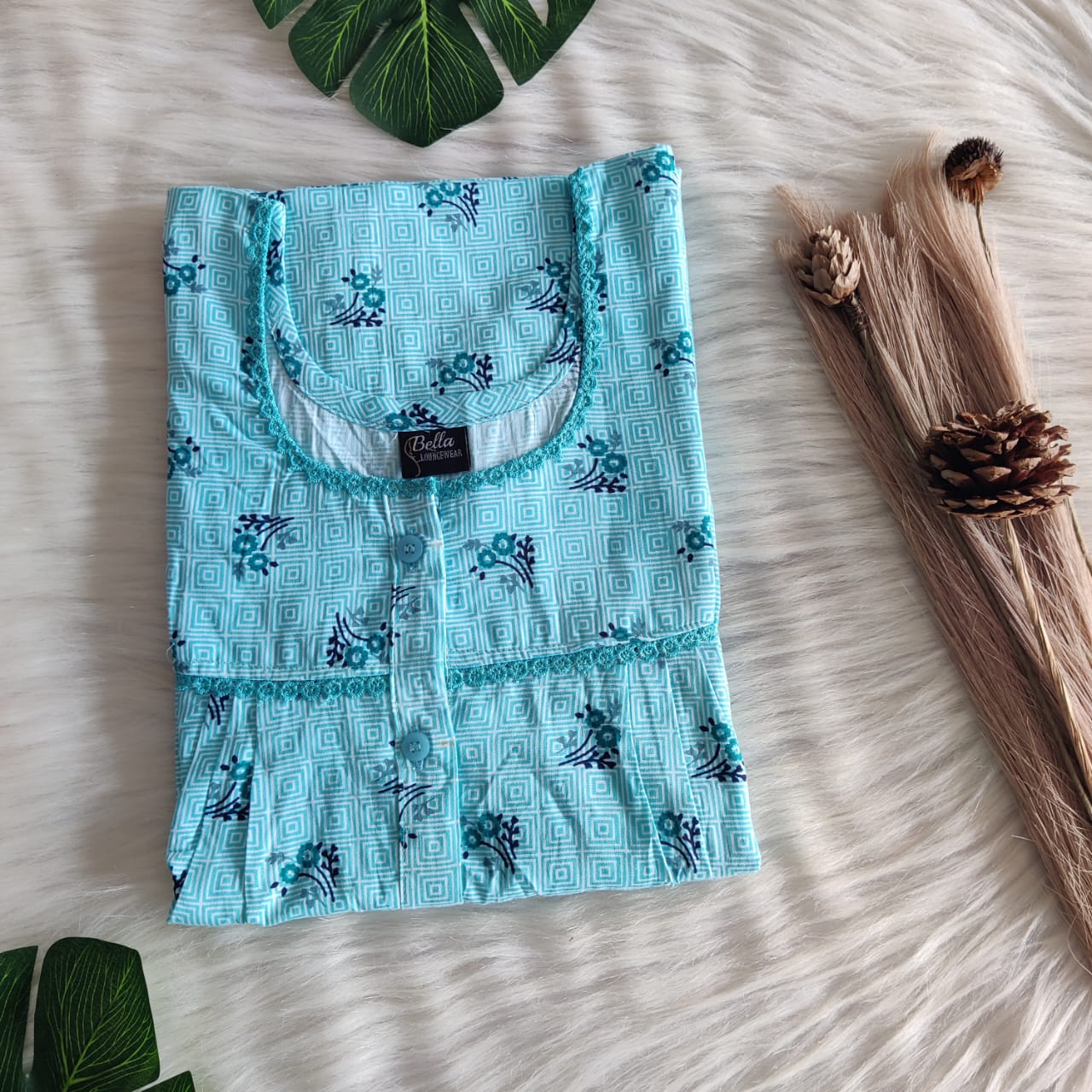 Aqua Blue Floral Printed Premium Cotton Lace Button Nighty | Free Size | Chest Width 44″| Length 54″-56″|