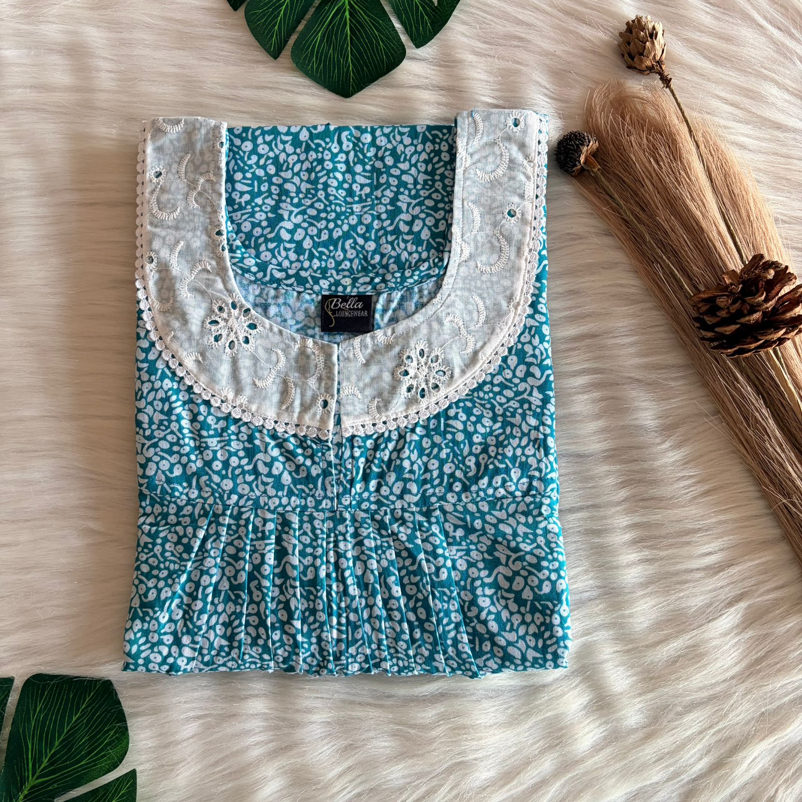 Aqua Green And White Floral Printed Premium Cotton Hakoba Lace Nighty | Free Size | Chest Width 44″| Length 54″-56″