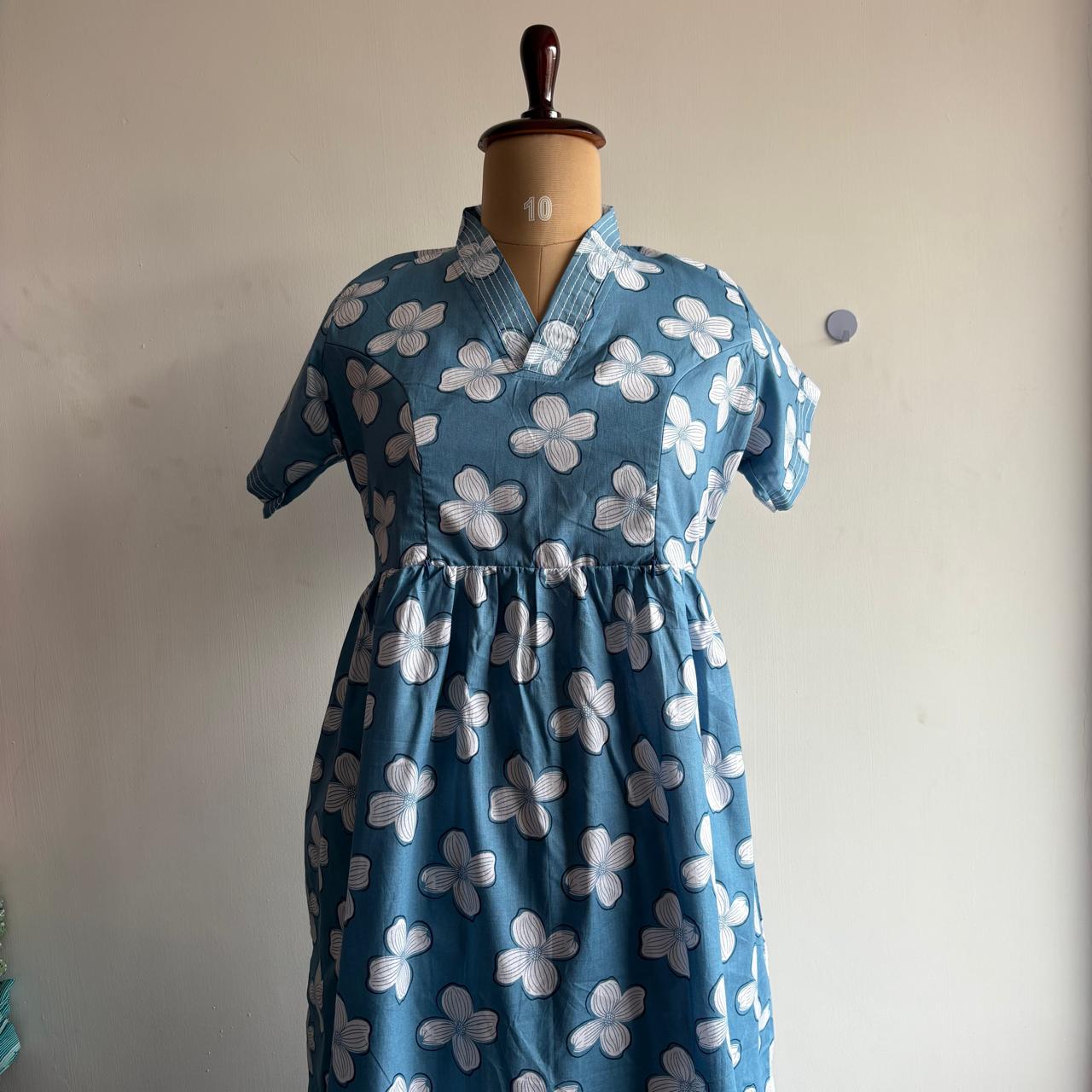 Ash Blue Floral Printed Premium Cotton V Collar Neck Short Maternity Gown | Free Size