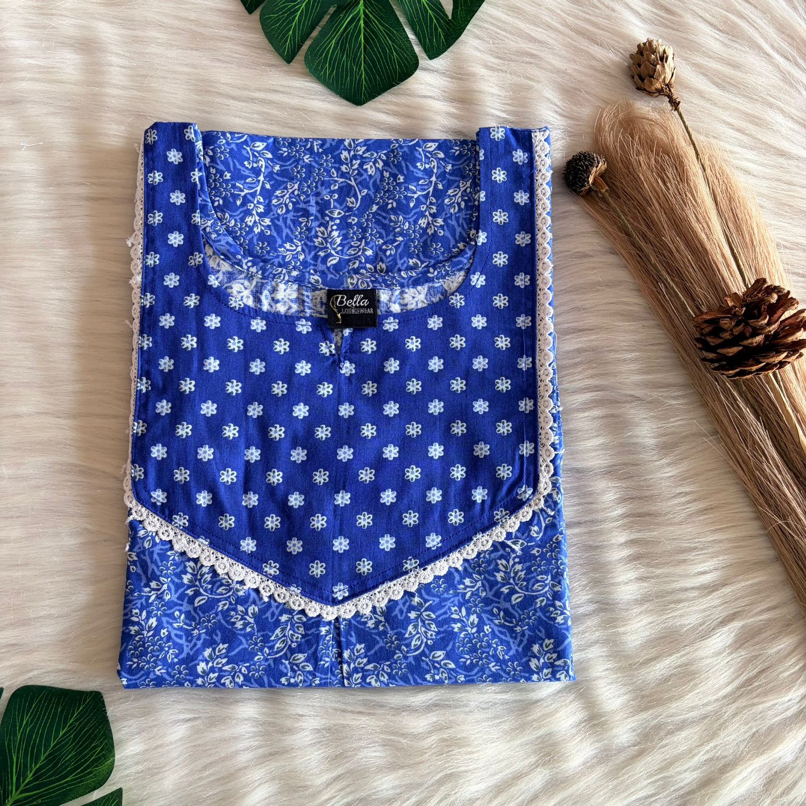 Blue And White Floral Printed Premium Cotton Mix N Match Lace Pocket Nighty | Free Size | Chest Width 44″| Length 56″