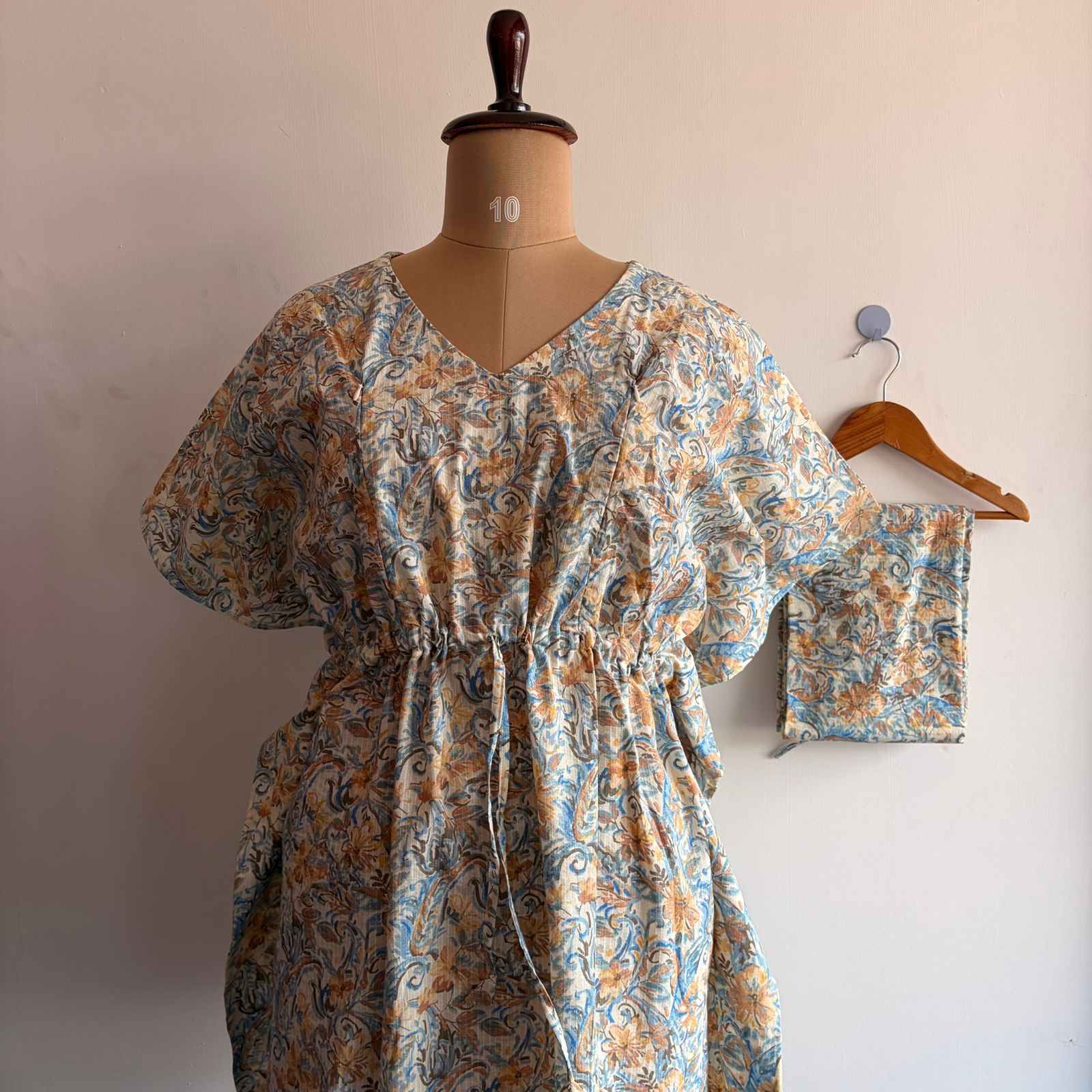 This night dress can be hand washed or a normal machine washed with cold water. Please make sure to dry the dress in a light shade away from direct sunlight. Prefer first wash as hand wash with cold water.