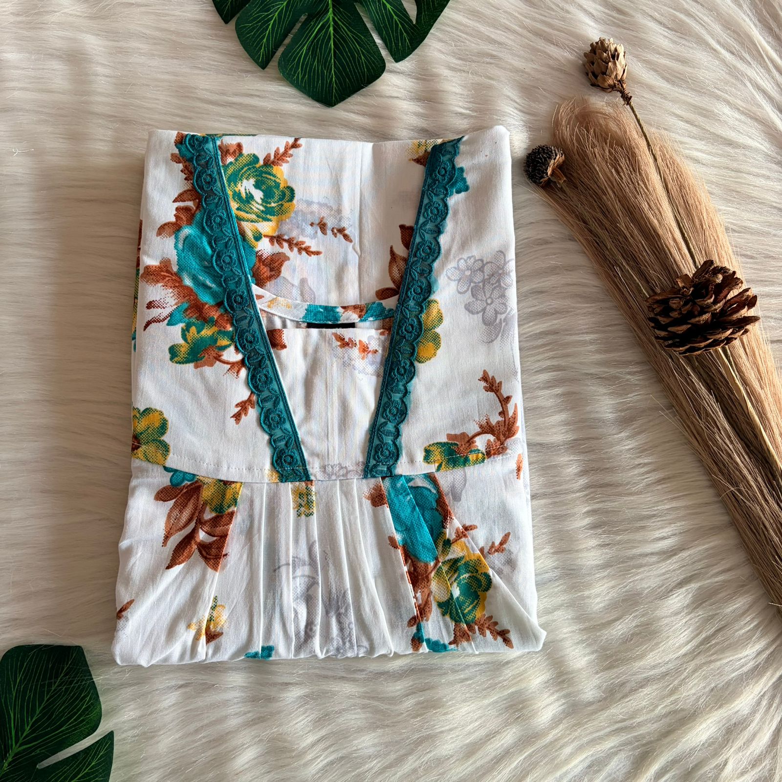 Blue Floral Printed White Premium Cotton V-Neck Lace Pleated Nighty | No Zip | Free Size | Chest Width 44″| Length 56″