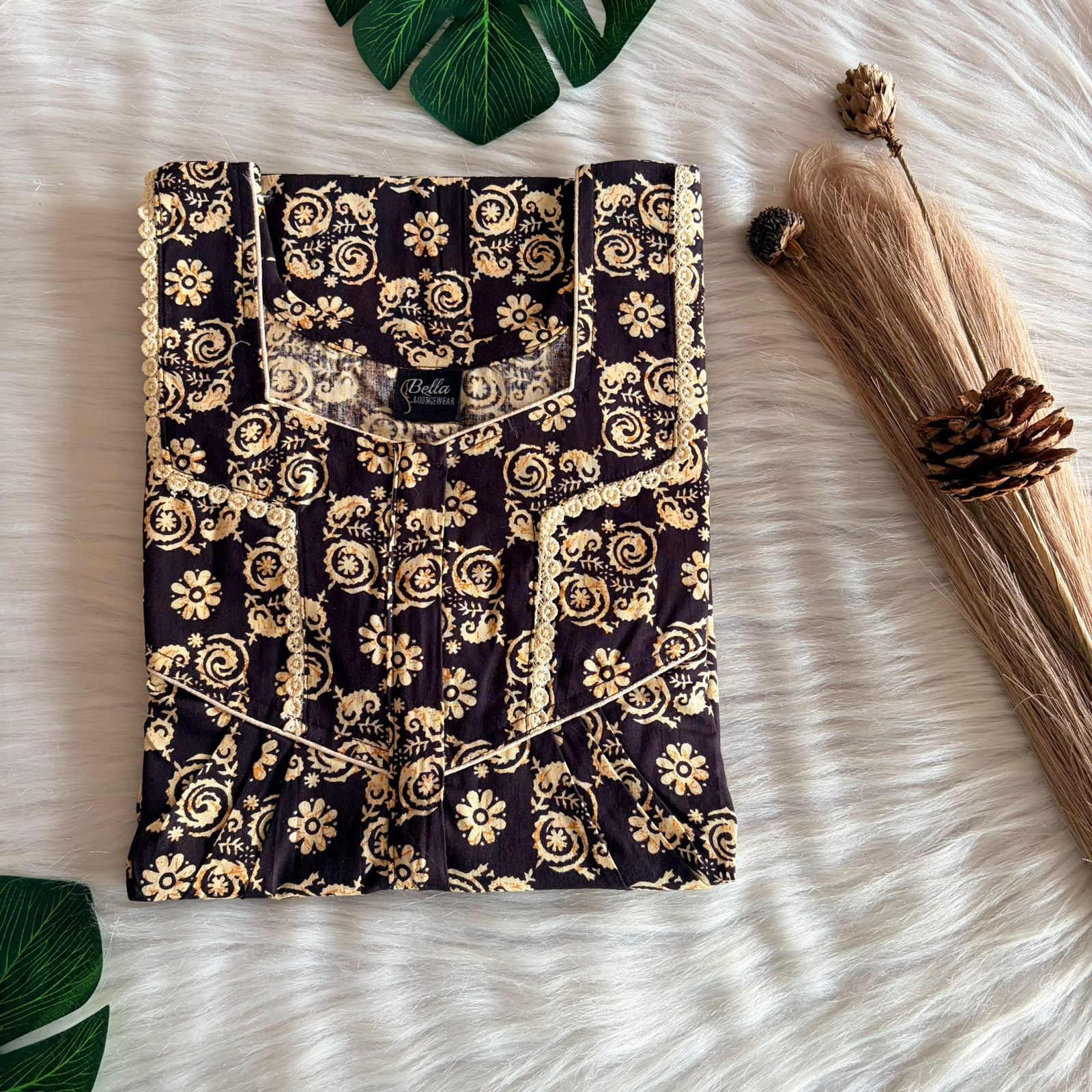 Coffee Brown Floral Printed Premium Cotton Long Zip Lace Feeding Nighty | Free Size | Chest Width 44″| Length 56″