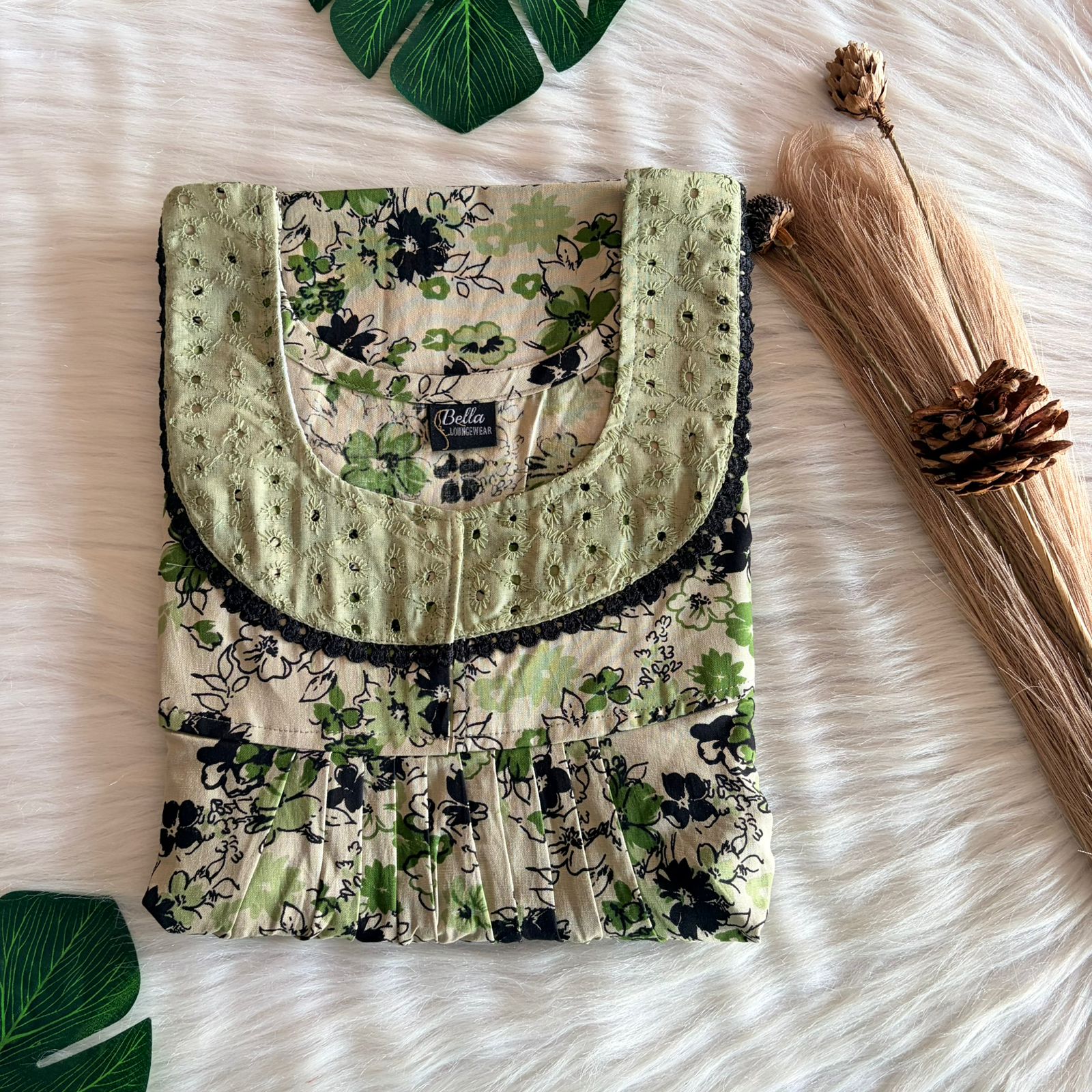 Green Floral Printed Premium Cotton Hakoba Lace Nighty | Free Size | Chest Width 44″| Length 54″-56″