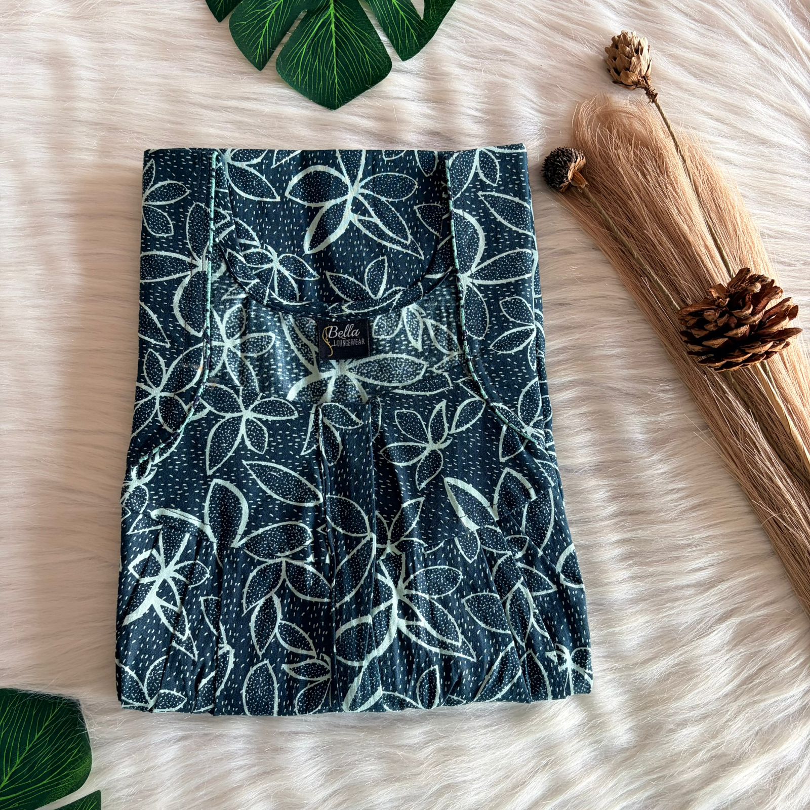 Green Floral Printed Premium Cotton Pleated Zip Nighty | Free Size | Chest Width 44″| Length 54″-55″