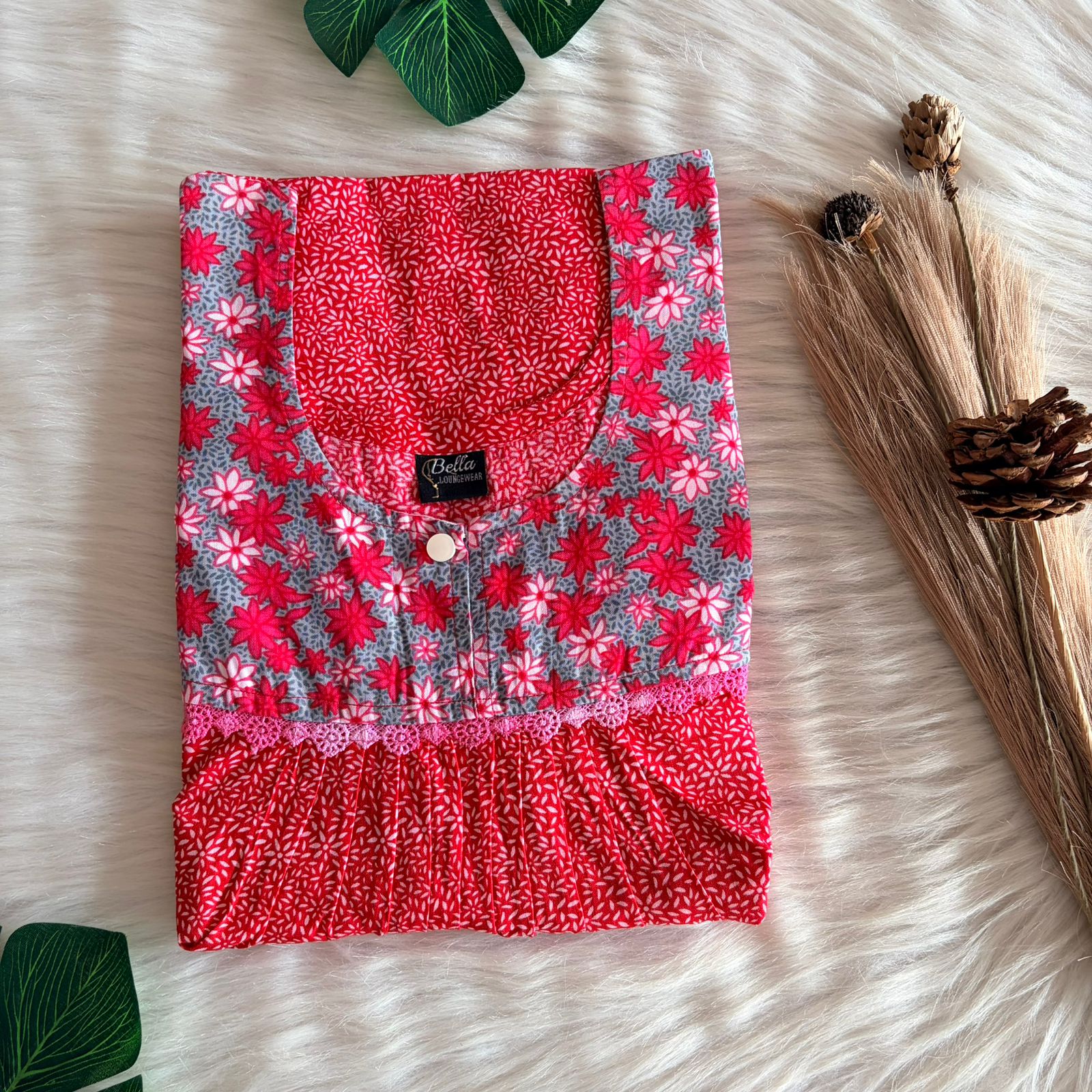 Grey And Red Floral Printed Premium Cotton Lace Nighty | Free Size | Chest Width 44″| Length 54″-56″