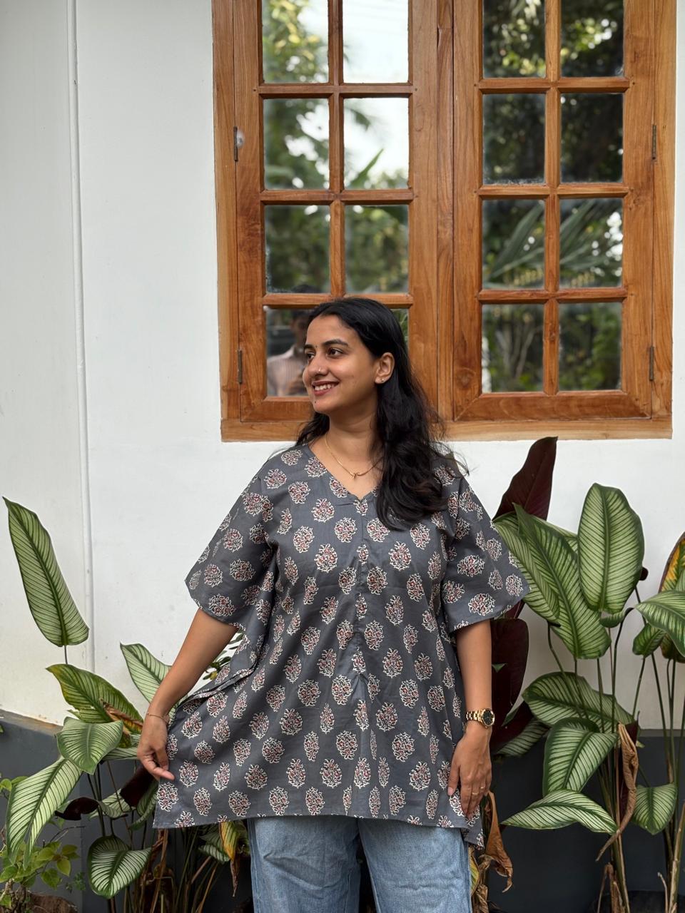 Grey Floral Printed Pure Cotton Short Feeding Kaftan With Centre Long Zip | Free Size | Chest Width 44″
