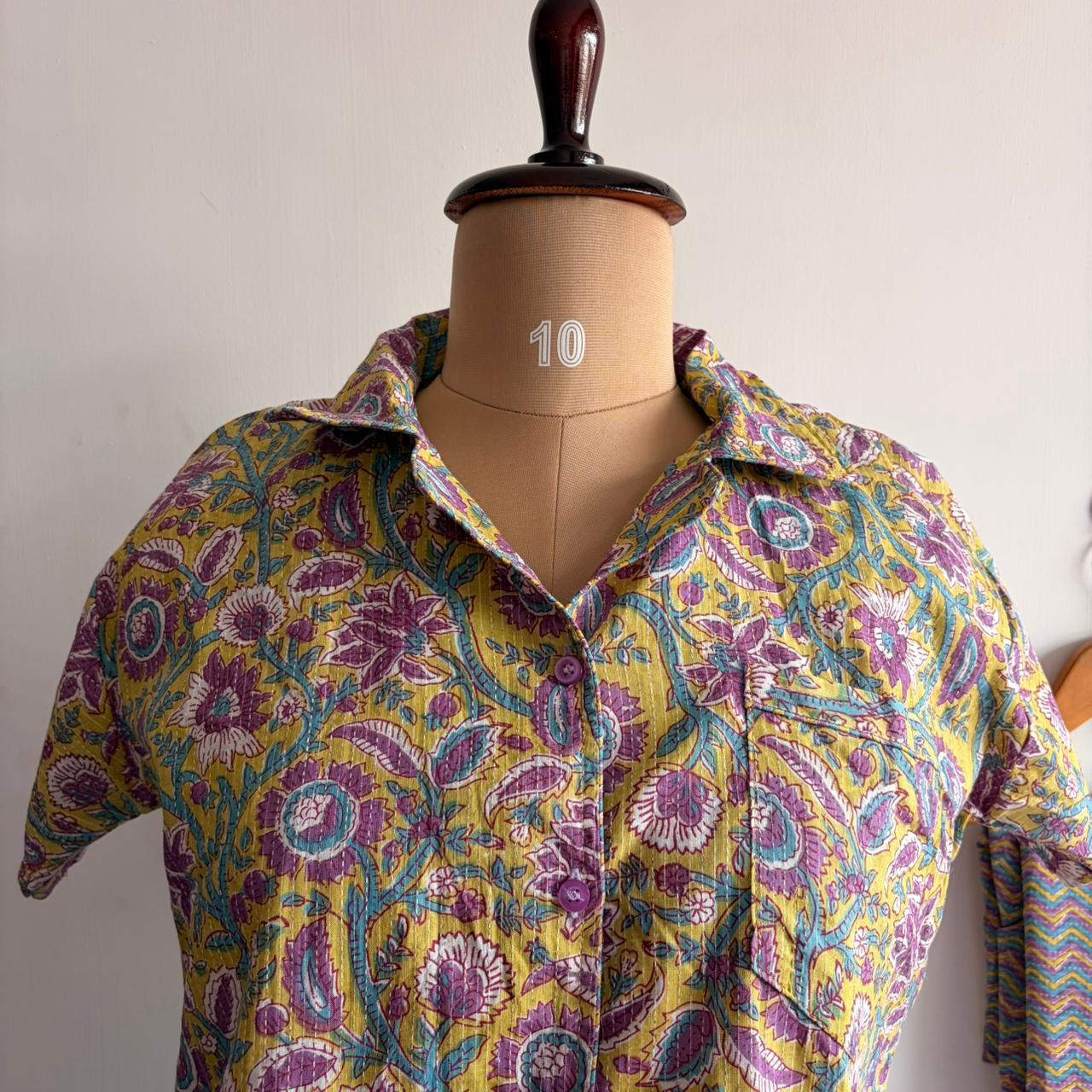Lemon Yellow And Purple Floral Printed Kantha Cotton Shirt Pyjama Set | Free Size|