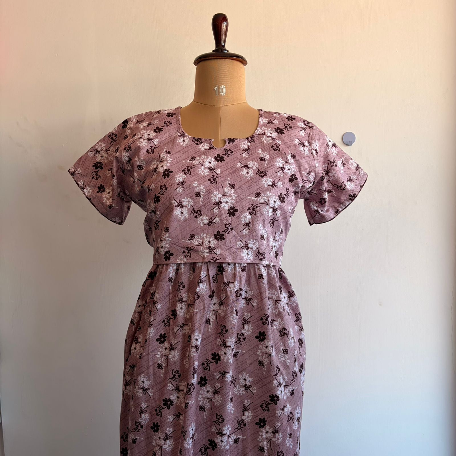 Pale Brown Floral Printed Premium Cotton Buttonless Zipless Short Maternity Nighty | Free Size | Chest Width 44″| Length 46″