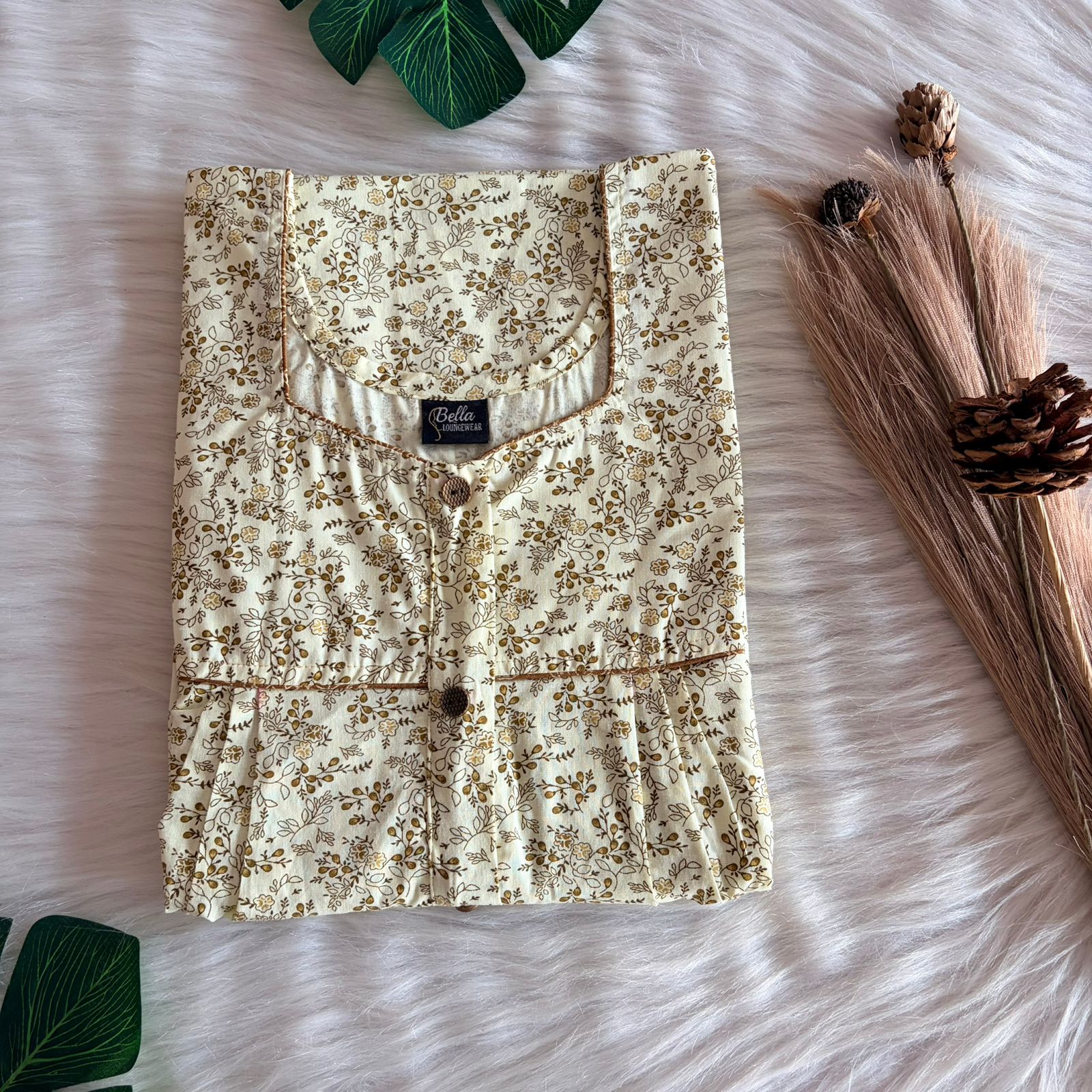 Pale Yellow Floral Printed Printed Pure Cotton Button Zip Nighty | Free Size | Chest Width 44″| Length 55″-56″