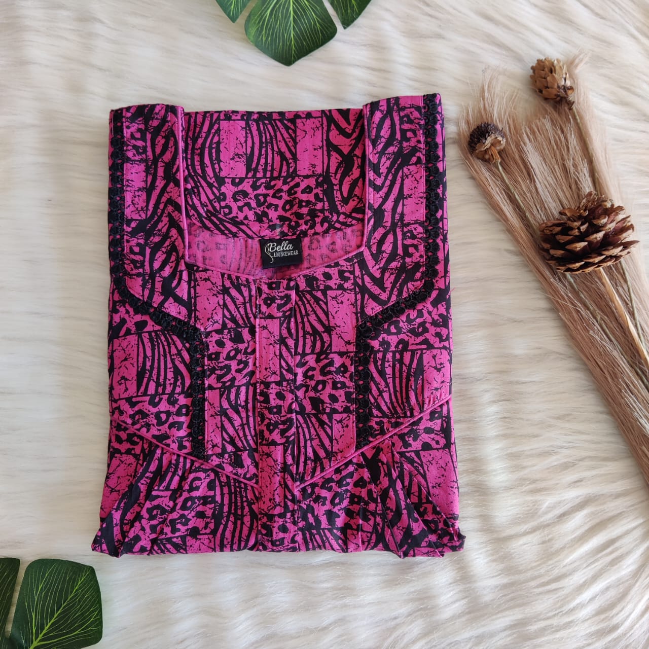 Pink And Black Printed Premium Cotton Long Zip Lace Feeding Nighty | Free Size | Chest Width 44″| Length 56″