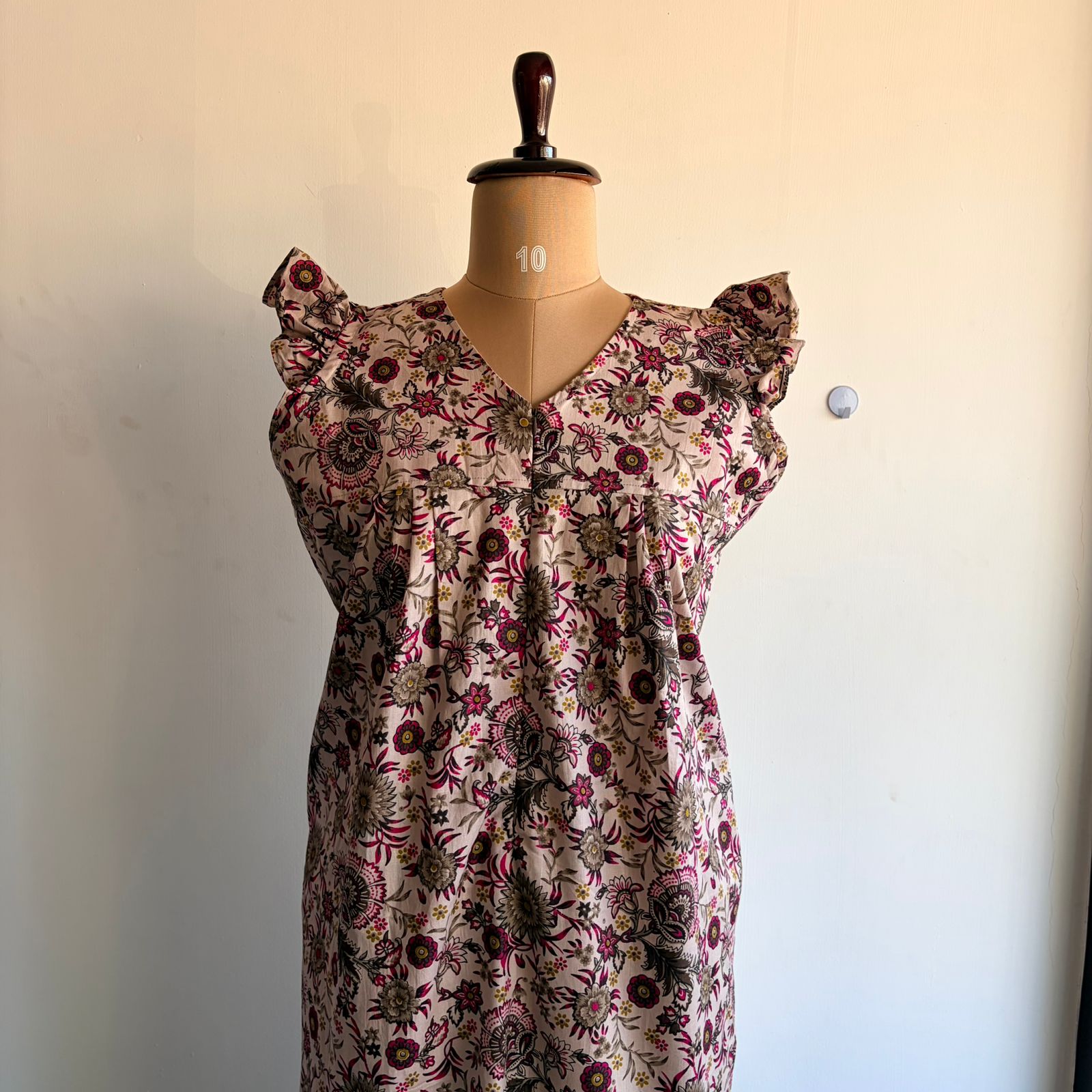 Pink And Cream Floral Printed Premium Cotton V- Neck Ruffle Sleeve Long Zip Short Maternity Gown | Free Size | Chest Width 44″| Length 44″