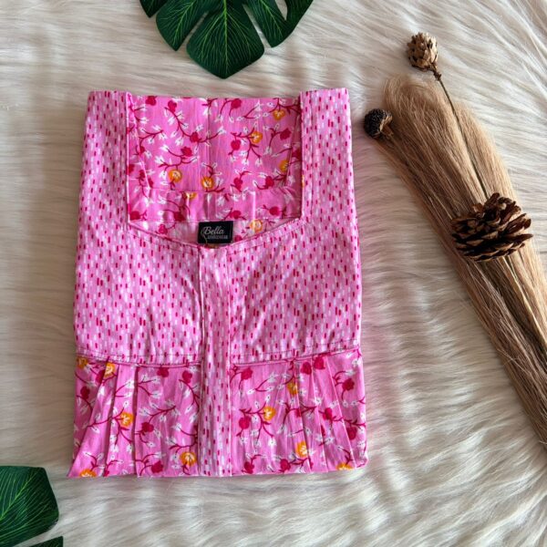 Pink And Yellow Floral Printed Premium Cotton Square Neck Pleated Nighty | Free Size | Chest Width 44″| Length 55″-56″