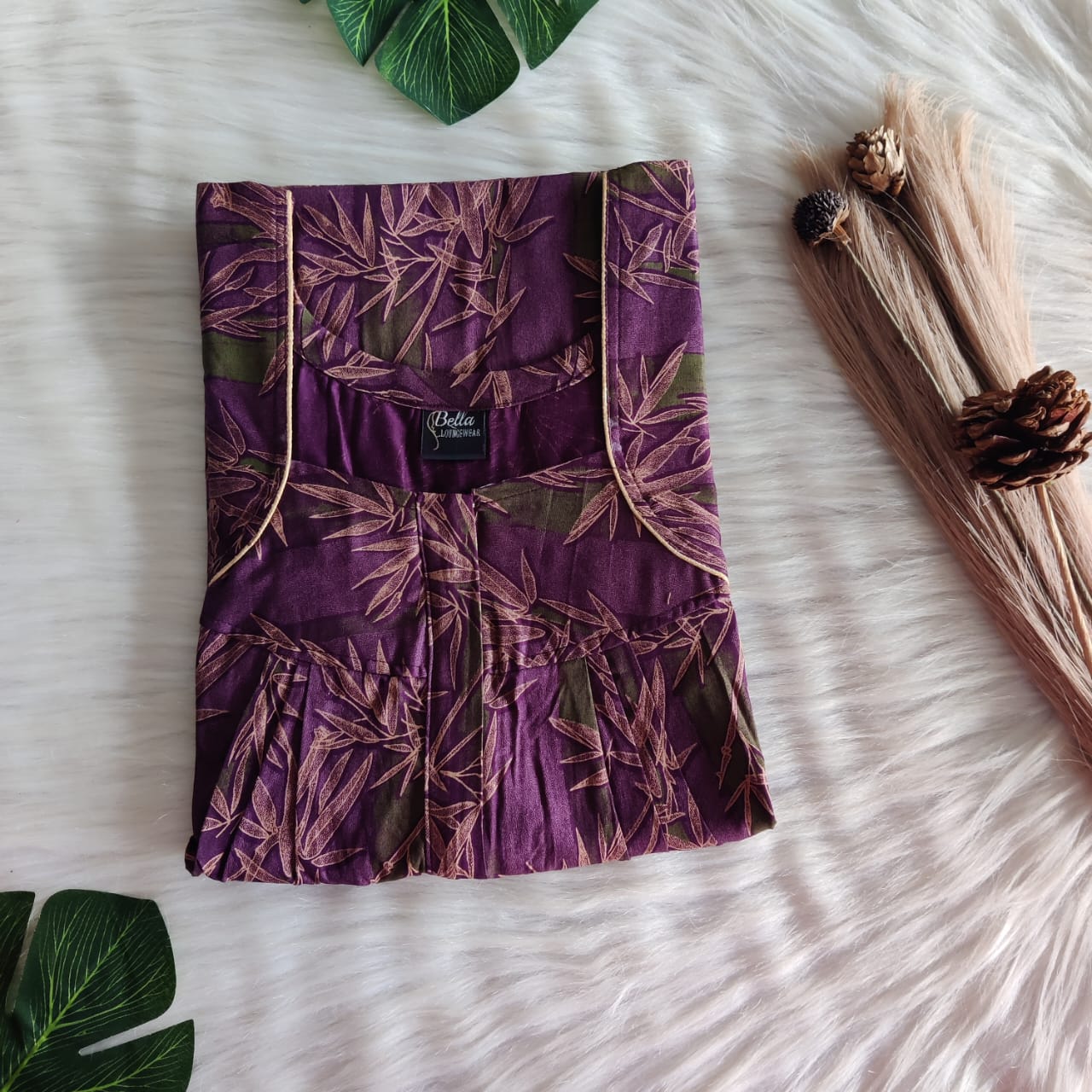 Violet Printed Discharge Cotton Pleated Zip Nighty | Free Size | Chest Width 44″| Length 54″-55″