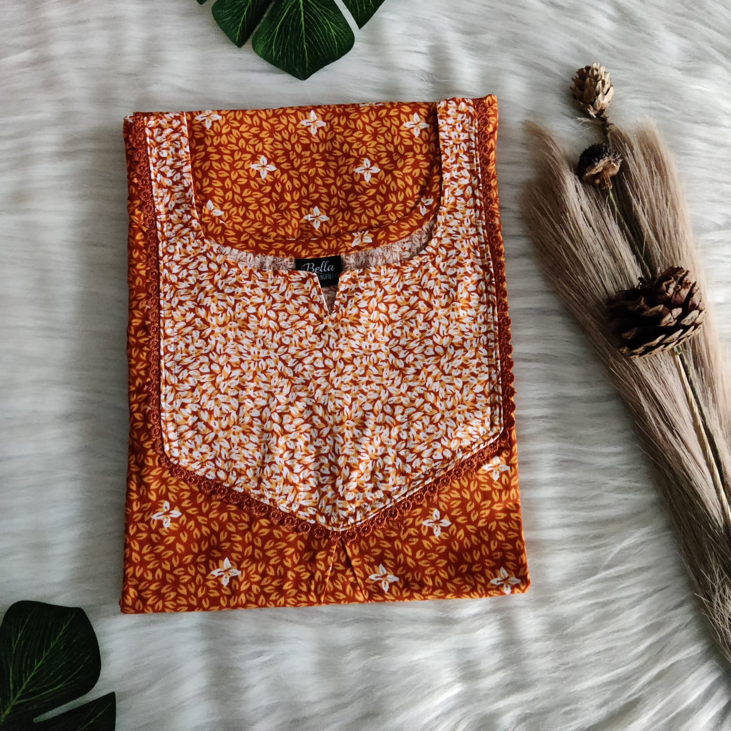 White And Orange Floral Printed Premium Cotton Mix N Match Lace Pocket Nighty