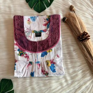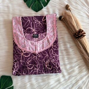 Violet Floral Printed Premium Cotton Hakoba Lace Nighty | Free Size | Chest Width 44″| Length 54″-56″