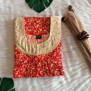 Red Printed Premium Cotton Hakoba Lace Nighty | Free Size | Chest Width 44″| Length 54″-56″