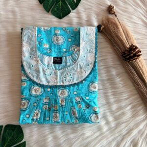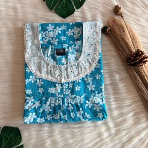 Aqua Blue Floral Printed Premium Cotton Hakoba Lace Nighty | Free Size | Chest Width 44″| Length 54″-56″
