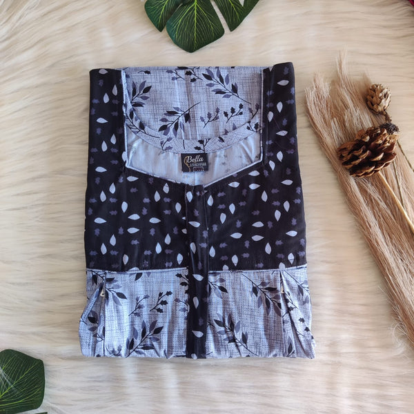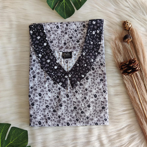 Black And Grey Floral Printed Premium Cotton Peter Pan Collar Nighty | Free Size | Chest Width 44″| Length 55″-56″