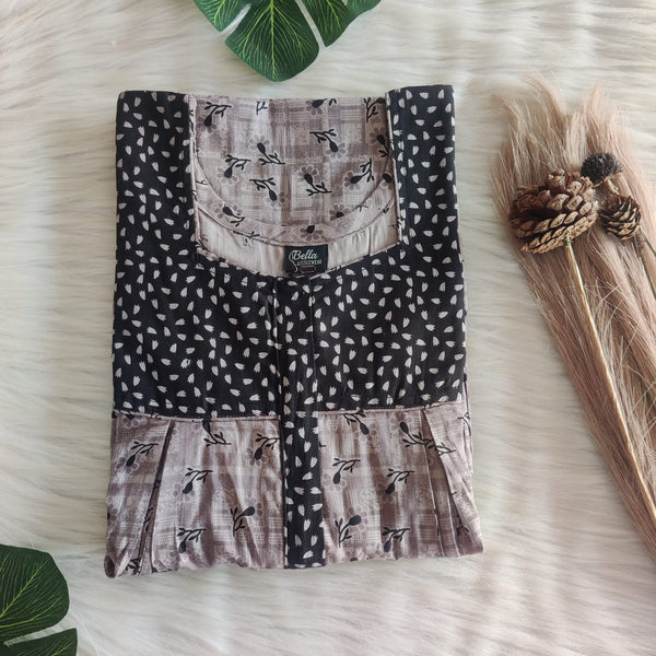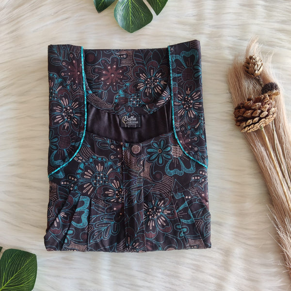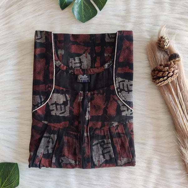 Black And Brown Printed Discharge Cotton Pleated Zip Nighty | Chest Width 44″ | Length 54″-55″