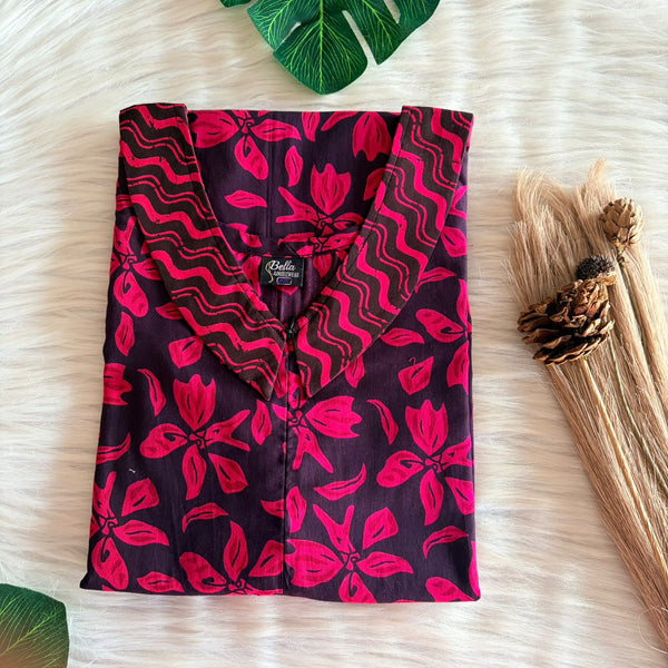 Black And Pink Printed Premium Cotton Pleated Vertical Zip Feeding Nighty | Free Size | Chest Width 44″| Length 54″-56″
