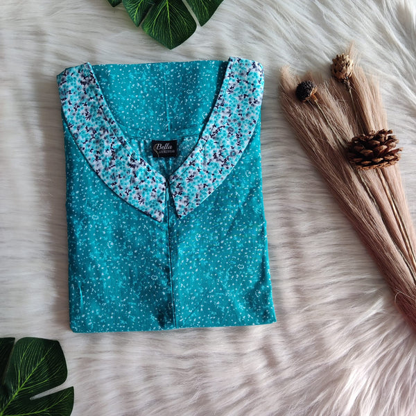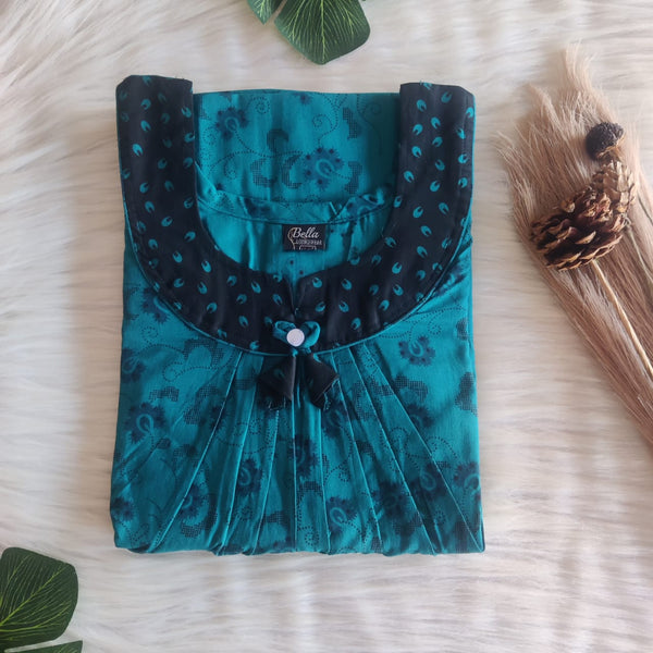 Black And Aqua Green Floral Printed Premium Cotton Peter Pan Collar Nighty | Free Size | Chest Width 44″| Length 55″-56″