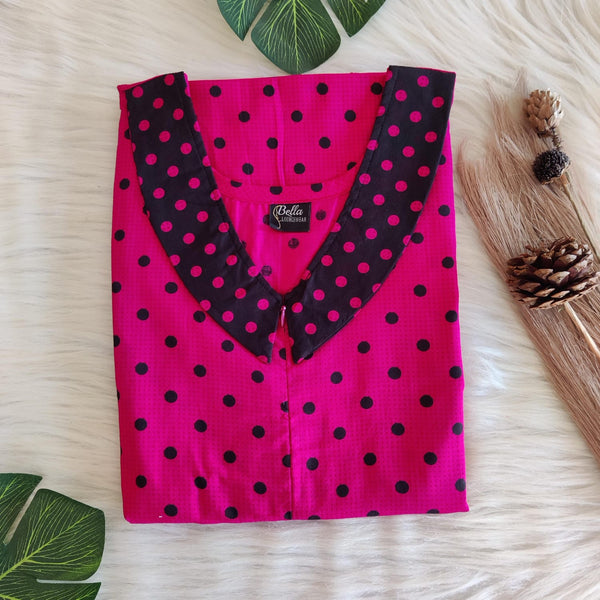 Black And Pink Dot Printed Premium Cotton Peter Pan Collar Long Zip Feeding Nighty | Free Size | Chest Width 44″| Length 56″