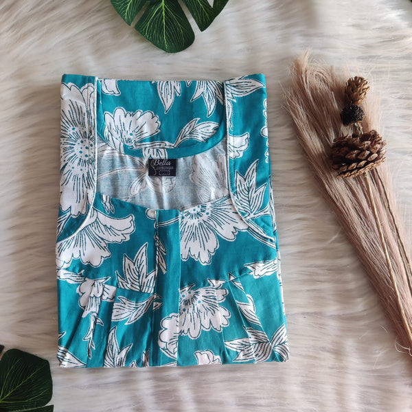 Blue And White Floral Premium Cotton Square Neck Pleated Nighty | Free Size | Chest Width 44″| Length 55″-56″