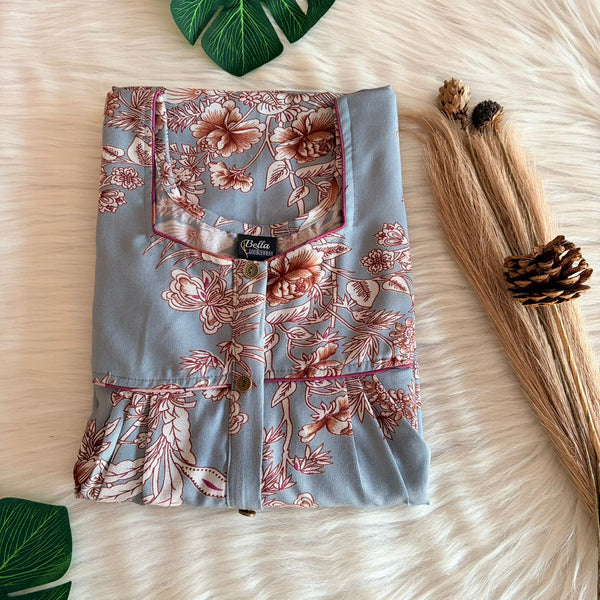 Blue And Brown Floral Printed Alfine Button Zip Nighty | Free Size | Chest Width 44″| Length 54″-56″