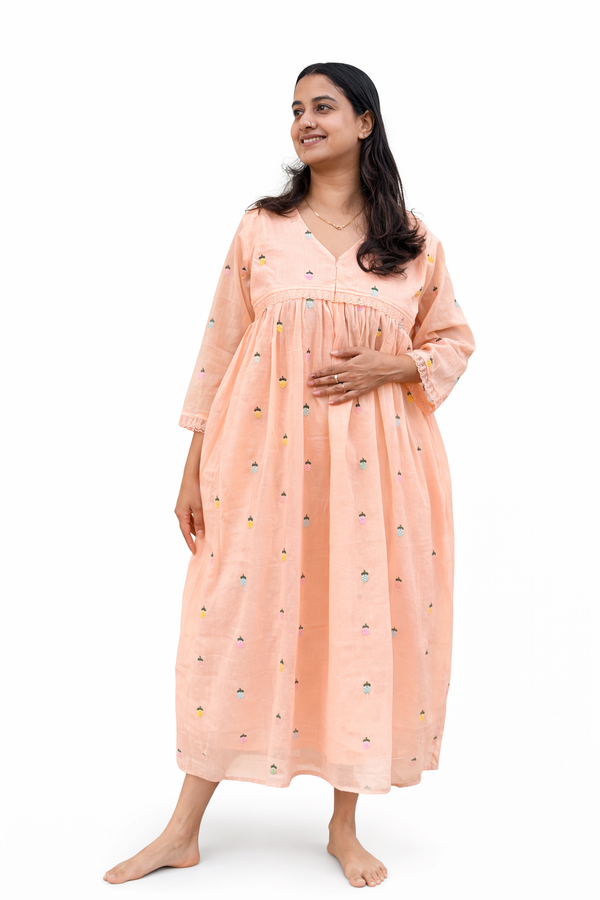Pastel Orange Printed Premium Cotton Two Side Vertical Lace Zip Feeding Nighty | Free Size | Chest Width 44″| Length 56″