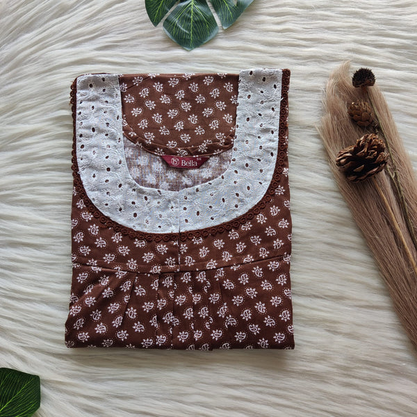 Coffee Brown Printed Premium Cotton Hakoba Lace Nighty | Free Size | Chest Width 44″| Length 54″-56″