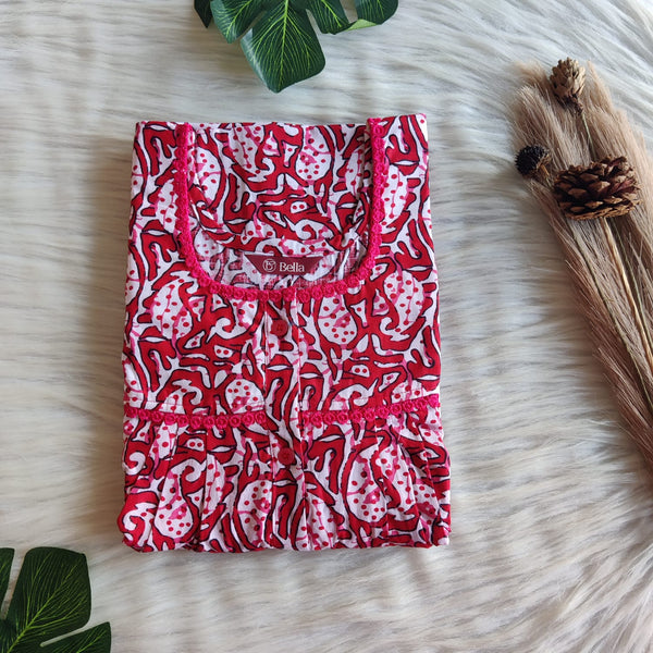 Red Printed Premium Cotton Button Zip Nighty | Free Size | Chest Width 44″| Length 55″-56″