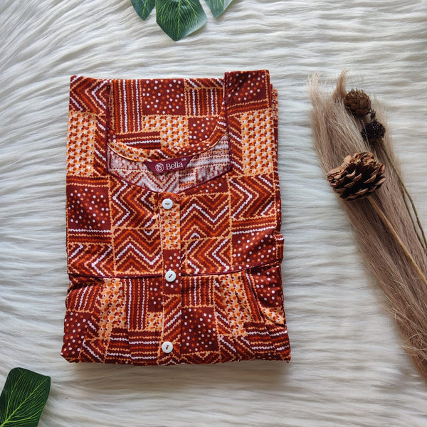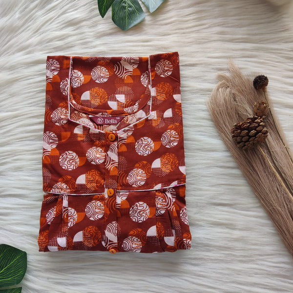 Brown Printed Premium Cotton Button Zip Nighty | Free Size | Chest Width 44″| Length 55″-56″