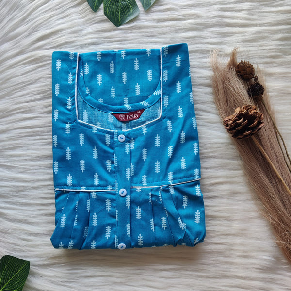 Blue Printed Premium Cotton Button Zip Nighty | Free Size | Chest Width 44″| Length 55″-56″