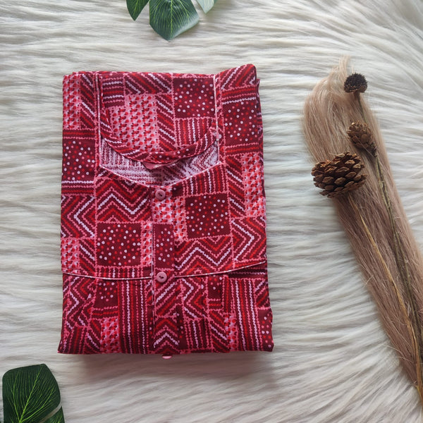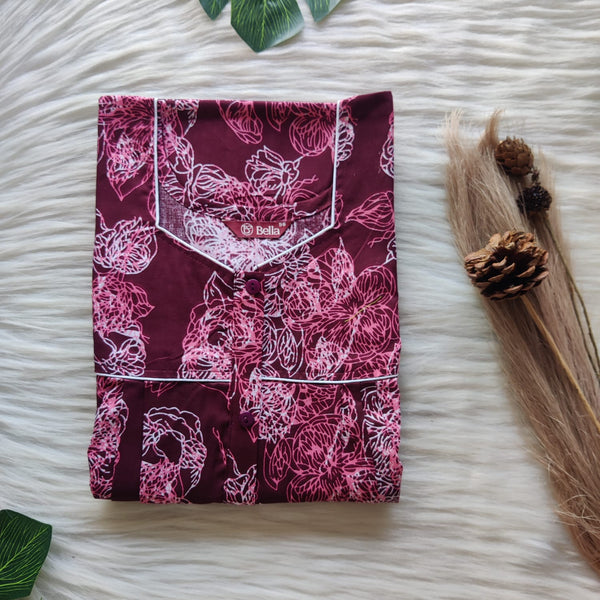 Maroon Printed Premium Cotton Button Zip Nighty | Free Size | Chest Width 44″| Length 55″-56″