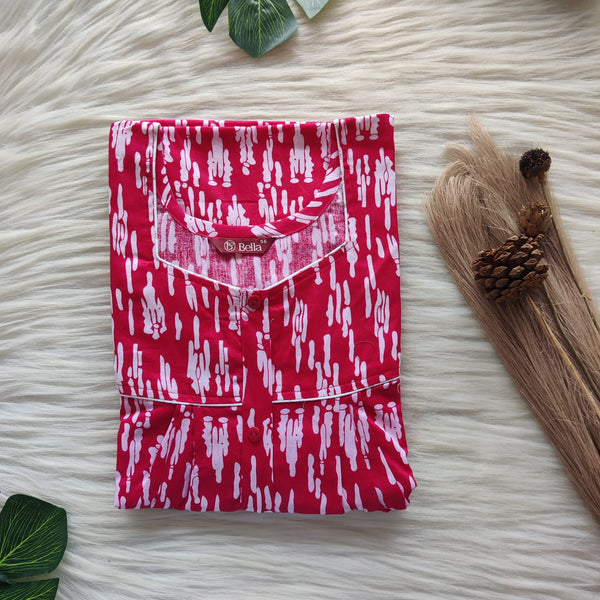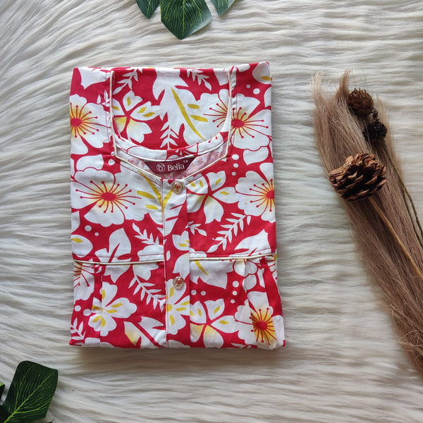Red Floral Printed Premium Cotton Button Zip Nighty | Free Size | Chest Width 44″| Length 55″-56″