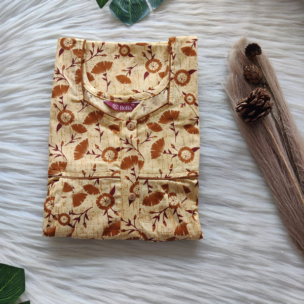 Brown Floral Printed Yellow Premium Cotton Button Zip Nighty | Free Size | Chest Width 44″| Length 55″-56″