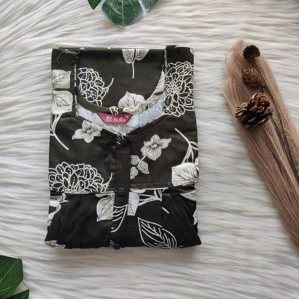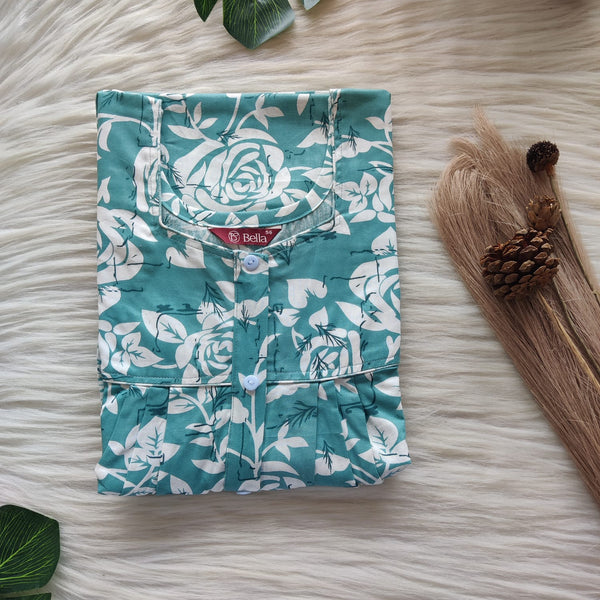 Green Floral Printed Premium Cotton Button Zip Nighty | Free Size | Chest Width 44″| Length 55″-56″
