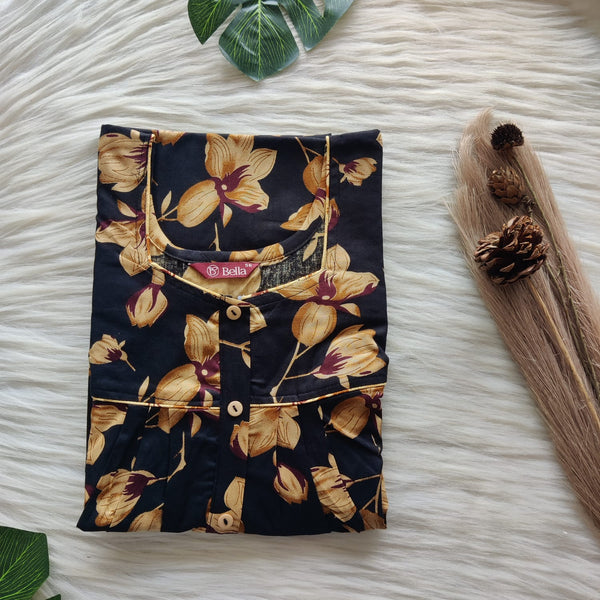 Yellow Floral Printed Black Premium Cotton Button Zip Nighty | Free Size | Chest Width 44″| Length 55″-56″