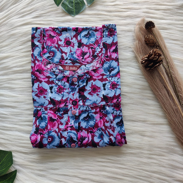 Pink And Blue Floral Printed Premium Cotton Button Zip Nighty | Free Size | Chest Width 44″| Length 55″-56″